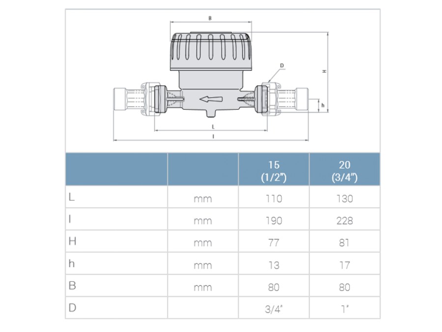 Vodoměr je určen pro vodovodní instalace s teplotou od 0,1 do 50°C a tlaku 16 bar. Dodává se v modré barvě pouzdra, disponuje otočným číselníkem o 360°. Vyrábí se i ve verzi pro teplou vodu (červené pouzdro). Obsahuje indukční předzařízení pro instalaci modulů datové komunikace M-BUS, drátové a bezdrátové M-BUS, nemagnetický pulzní výstup a LoRa. Tento vodoměr je kompatibilní s následujícími moduly v naší nabídce: Upozornění: u všech vodoměrů je velikost připojovacích závitů vždy o 1 dimezi větší než udávané hodnoty! Např. vodoměr s označením 1/2" má připojovací závity 3/4".