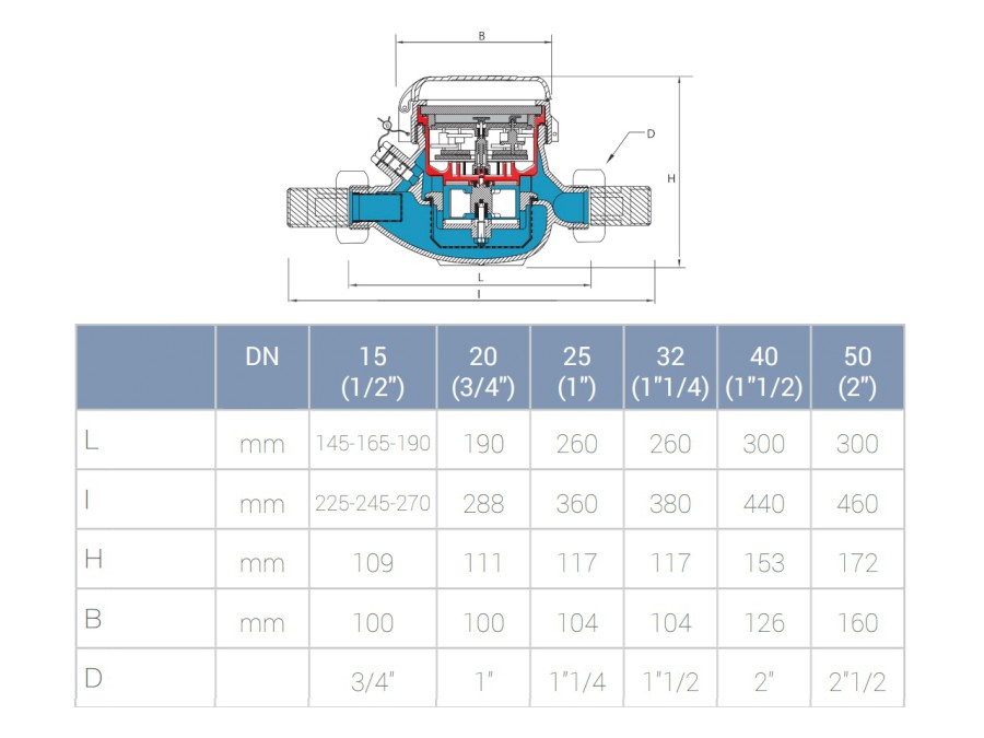 Upozornění: u všech vodoměrů je velikost připojovacích závitů vždy o 1 dimezi větší než udávané hodnoty! Např. vodoměr s označením 1/2" má připojovací závity 3/4".