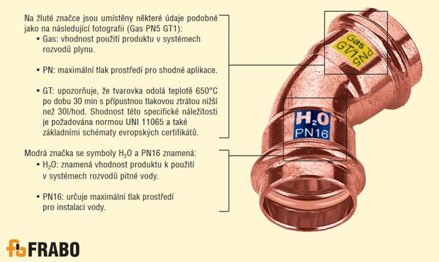 FRABOPRESS je jediný lisovací systém, jehož tvarovky umožňují dvojí použití na PLYN a VODU. Dvě značky rozdílných barev (žlutá pro plyn a modrá pro vodu) současně umístěné na tvarovce odlišují a charakterizují tuto velkou inovaci. Speciální těsnění je technologicky modifikováno a certifikováno podle požadavků norem EN 681/1 (voda) a EN 549 (plyn).