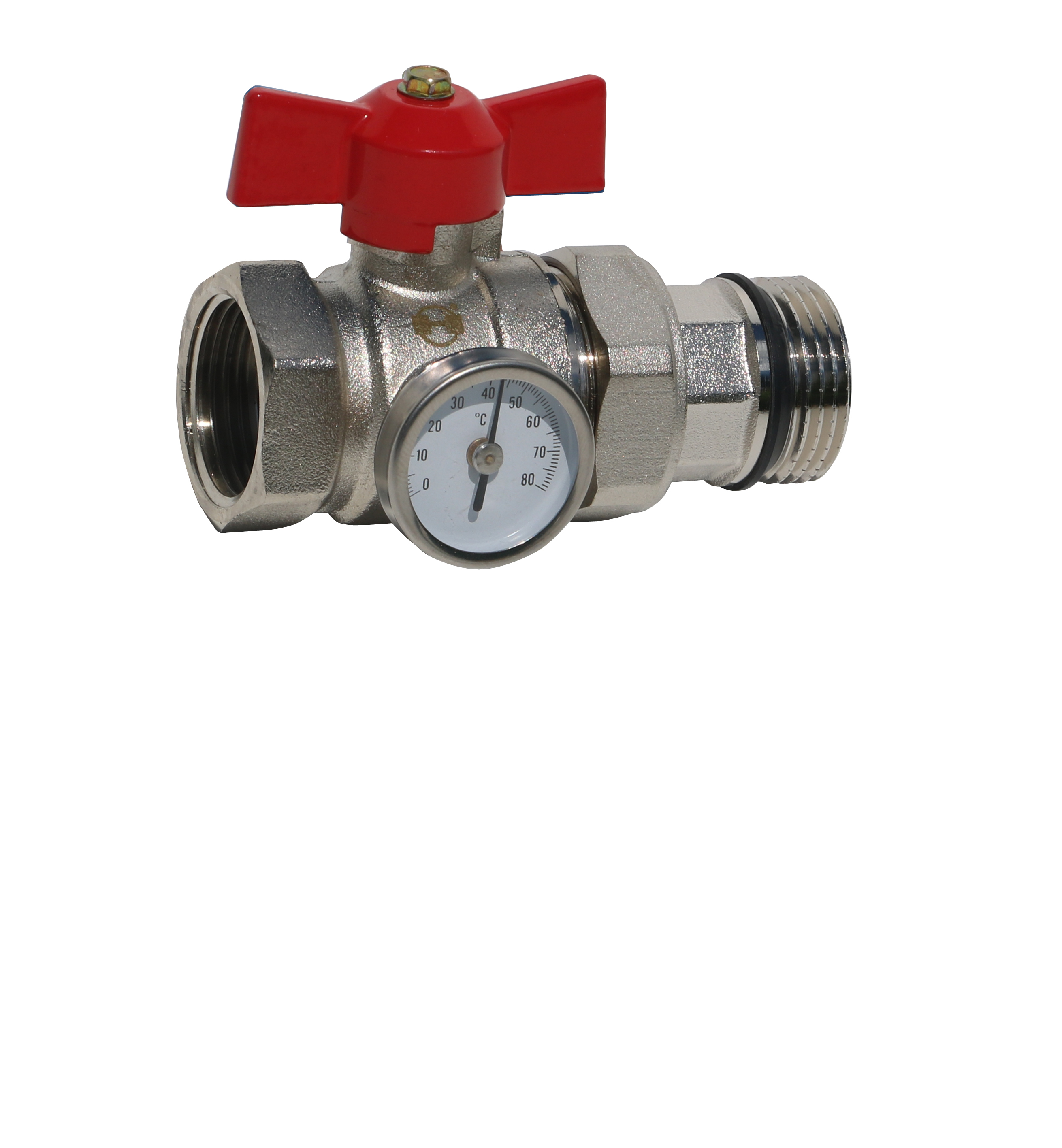 Přímý kulový kohout H-LINE ŠMM s teploměrem a šroubením, červený.