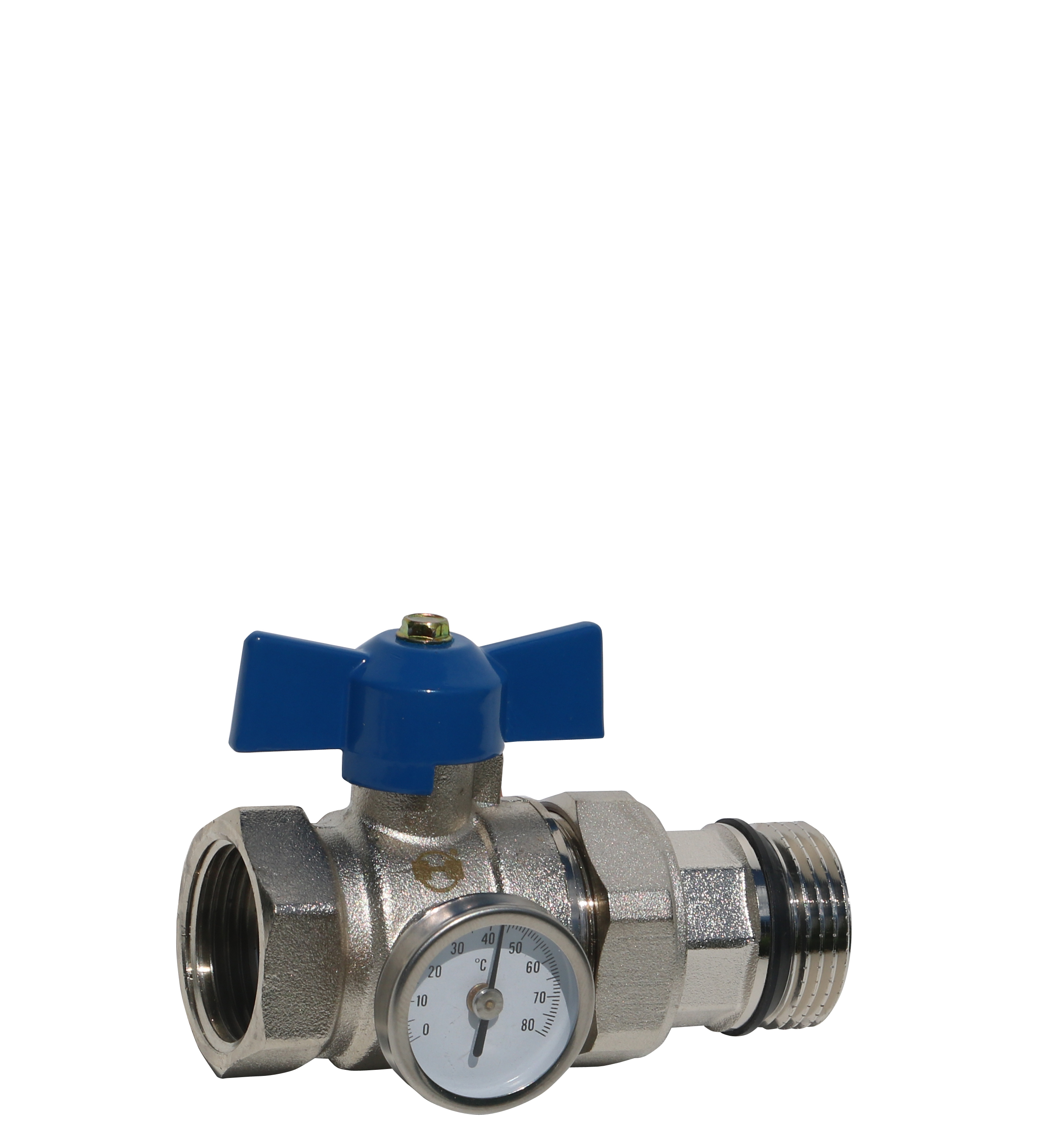Přímý kulový kohout H-LINE ŠMM s teploměrem a šroubením, modrý.