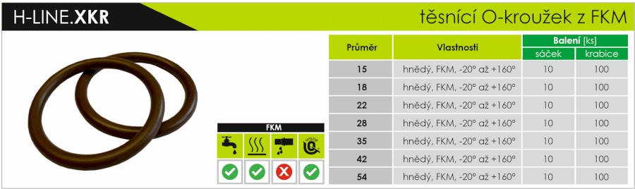 Slouží jako možná náhrada za černé EPDM O-kroužky, které jsou součástí všech tvarovek H-LINE INOXPRESS 304. Pro speciální vysokoteplotní a chemické aplikace je vhodné použít tyto O-kroužky hnědé barvy vyrobené z FKM (fluorokaučuk). FKM je pryž pro vysoce náročné podmínky. Vhodná pro agresivní chemikálie, oleje, benzín, naftu, je odolná vysokým teplotám. Tento O-kroužek je plně kompatibilní se všemi tvarovkami H-LINE INOXPRESS 304.