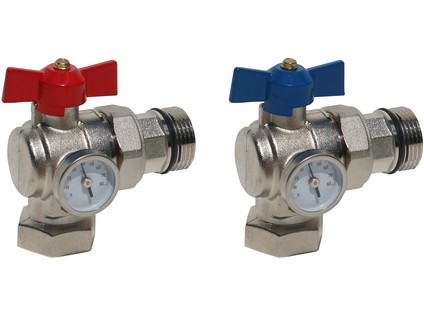 Set rohových kulových kohoutů H-LINE ŠMM s teploměrem a šroubením. Set 2 kusů.