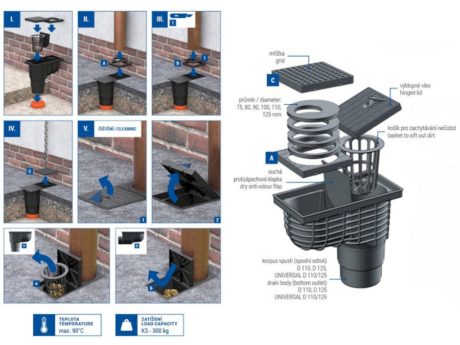 Výrobek je určen pro odvod dešťových (povrchových) vod do kanalizačních systémů vně budov a umožňuje připojení okapových svodů.