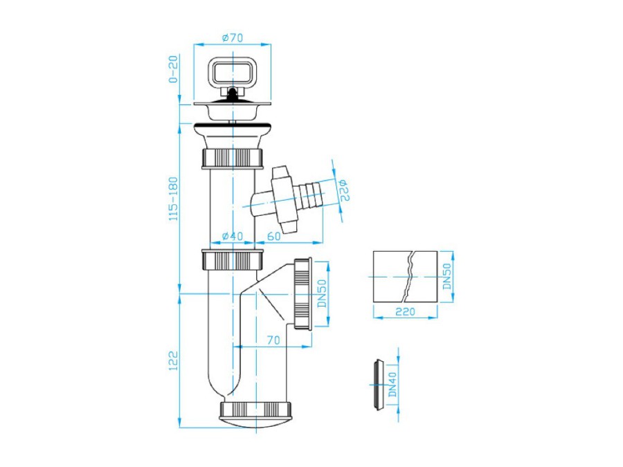 Dřezový sifon s pračkovým vývodem a nerezovou miskou.