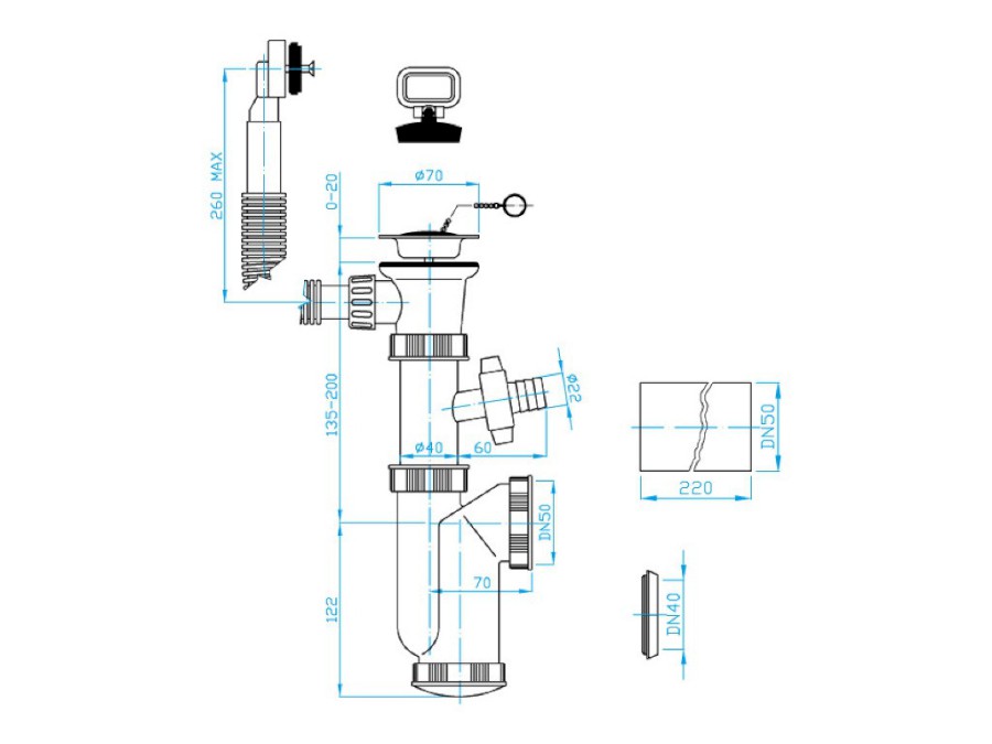 Dřezový sifon s pračkovým vývodem, univerzálním přepadem a zátkou s řetízkem DN 50.