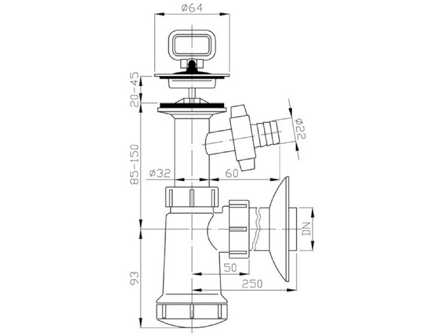 E sifon umyvadlový s nerezovou zátkou, pračkovým vývodem a miskou DN 40.