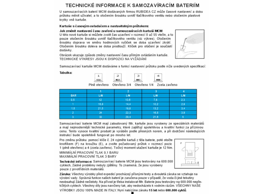 Většina ventilů MCM je vybavena kartušemi s jednoduchým regulováním doby výtoku. Různé testy životnosti dokázali, že kartuše MCM vydrží více než 600.000 cyklů. Jednotlivé materiály použité k výrobě kartuše jsou pečlivě kontrolovány. Veškeré vnitřní komponenty jsou vyrobené ze speciálního materiálu ACETAL anticalcare, ačkoliv se zdají být z obyčejného plastu, a jsou vhodné pro styk s pitnou vodou. Kartuše je samočistící a obsahuje vnitřní filtr pro zachytávání hrubších nečistot. Správné používaní spolu s instalací přívodního filtru umožňuje dlouhodobou a správnou funkčnost ventilu.
