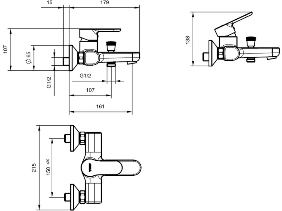 Kvalitní a designově velmi povedená vanová baterie TIEMME ve standardní rozteči 150 mm ve verzi bez sprchového příslušenství.