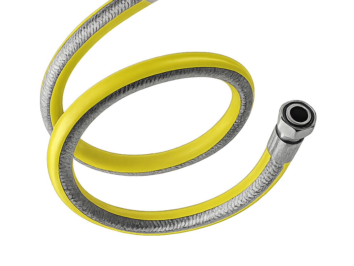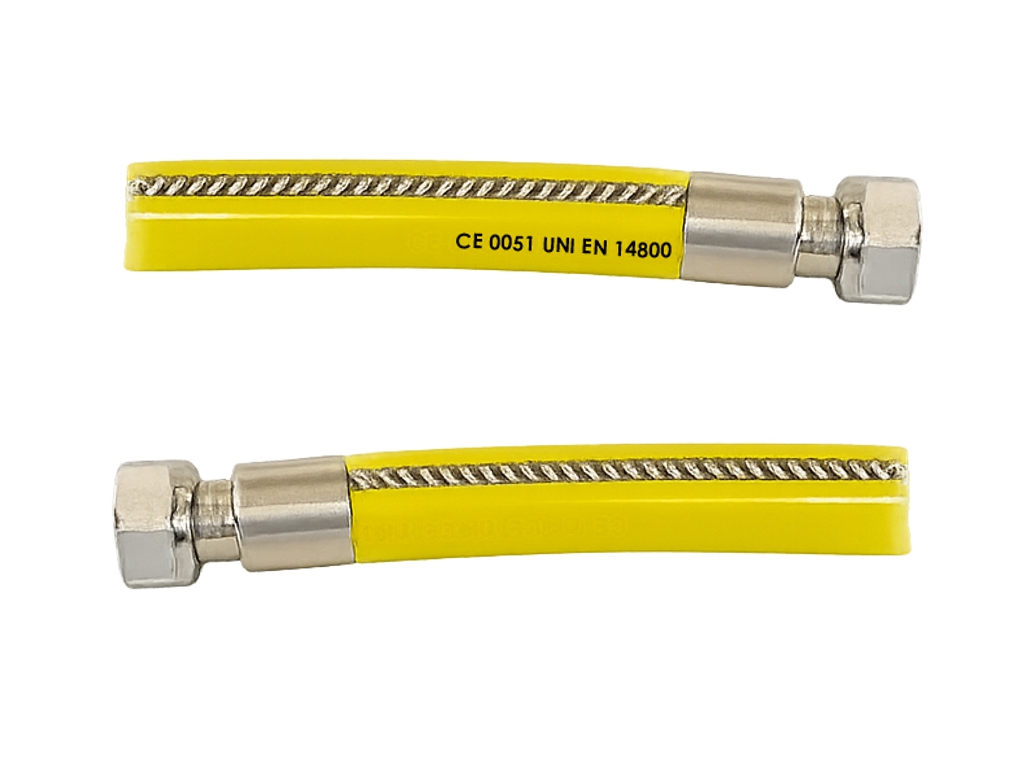 MBM plynová připojovací hadice z ocelového vlnovce k domácím spotřebičům podle normy UNI-EN 14800 (CE 0051) s vnitřním ocelovým opletem a žlutým ochranným obalem. Splňuje nové normy na požární odolnost.