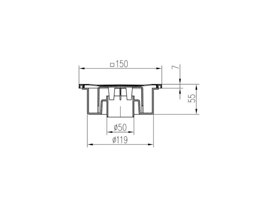 Podlahová vpusť spodní D 50/55 s vodní hladinou a nerezovou mřížkou je určena pro vnitřní použití do technických prostor, koupelen apod.