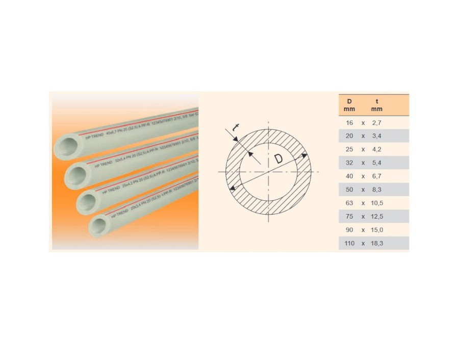 Tlakové plastové trubky jsou vyráběny z materiálů PPR TYP 3 random kopolymeru polypropylenu šedé barvy, který vykazuje vysokou flexibilitu a výbornou tlakovou odolnost pro rozvody studené i teplé vody a topení.