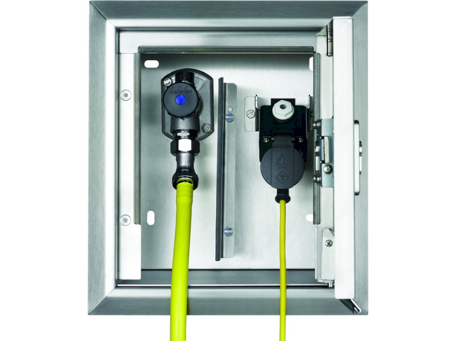 Skupina KEMPER 'Tresor' – skříně na stěnu z ušlechtilé oceli jsou vyrobeny z vysoce jakostní ušlechtilé oceli pro pohodlné zásobování vodou a elektrickým proudem na centrálním místě vně budovy.