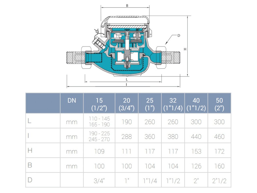 Upozornění: u všech vodoměrů je velikost připojovacích závitů vždy o 1 dimezi větší než udávané hodnoty! Např. vodoměr s označením 1/2" má připojovací závity 3/4".