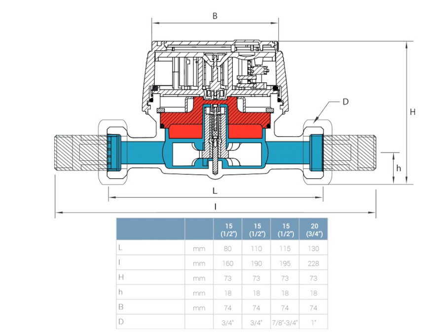 Upozornění: u všech vodoměrů je velikost připojovacích závitů vždy o 1 dimezi větší než udávané hodnoty! Např. vodoměr s označením 1/2" má připojovací závity 3/4".