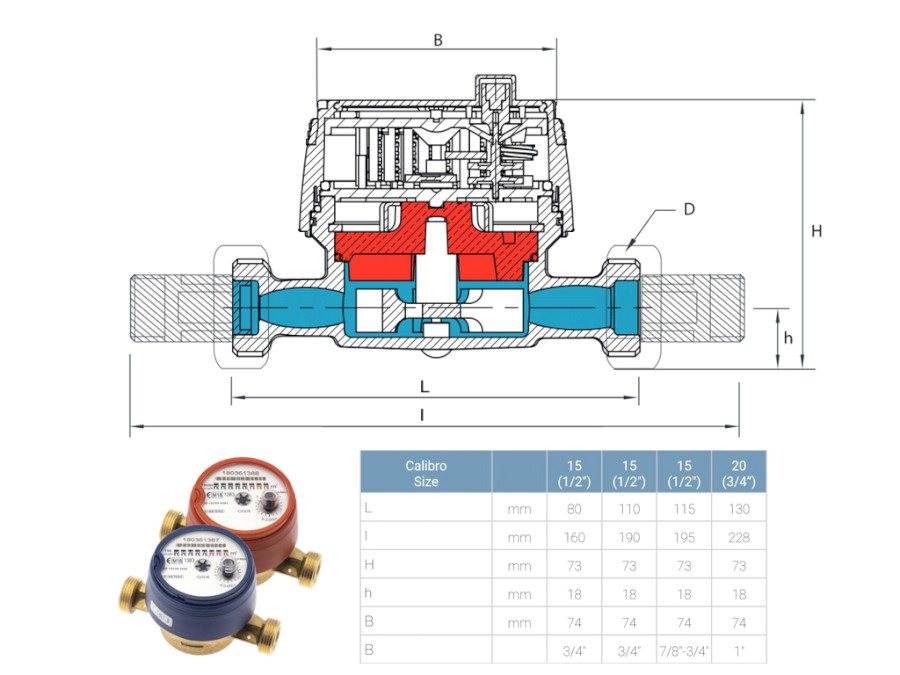 Upozornění: u všech vodoměrů je velikost připojovacích závitů vždy o 1 dimezi větší než udávané hodnoty! Např. vodoměr s označením 1/2" má připojovací závity 3/4".
