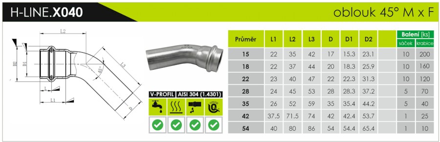 H-LINE INOXPRESS 304 oblouk 45° M x F