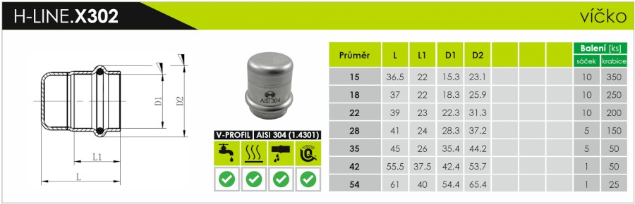 Nerezový lisovací systém H-LINE INOXPRESS 304 je vyroben z nerezové oceli AISI 304 (1.4301 dle EN) a je speciálně navržen pro použití v rozvodech topných systémů a pro rozvody vody, včetně pitné vody a požárních rozvodů. Disponuje také systémem LEAK DETECT pro včasné odhalení nezalisovaných spojů fitinek. Lisování fitinek lze realizovat pomocí čelistí s profilem „V”. Systém je plně certifikován VÚPS a splňuje veškeré hygienické požadavky.