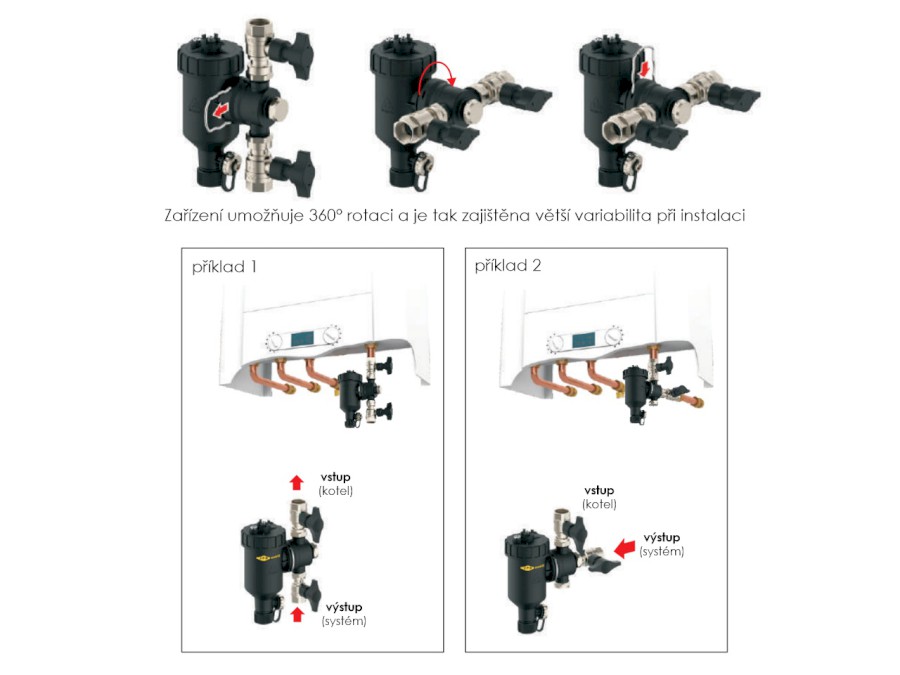 Otočný magnetický odlučovač nečistot s kulovými kohouty.