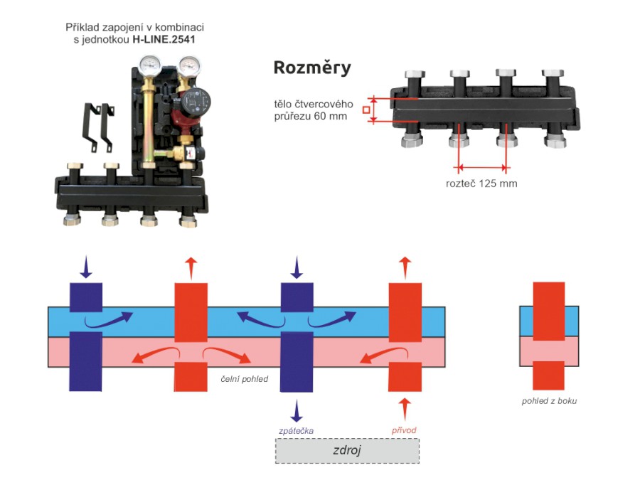 Umožňuje připojení 2-3 nebo 3-5 čerpadlových jednotek s roztečí 125 mm a přívodem topné vody vpravo (např.H-LINE.2541)