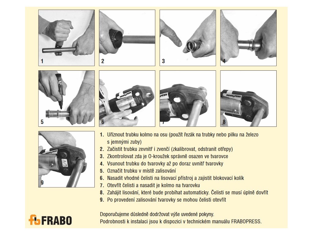 FRABOPRESS C-STEEL je systém složený z trubek a lisovacích tvarovek z uhlíkaté oceli, využitelný jak v soukromém tak veřejném sektoru. Speciální pozinkování trubek a tvarovek galvanizací garantuje vyšší antikorozní odolnost a zajišťuje trvanlivost po dlouhá léta. Je to ideální doplněk systémů FRABOPRESS, se kterými sdílí shodné nástroje k instalaci. Tvarovky se lisují profilem "V".