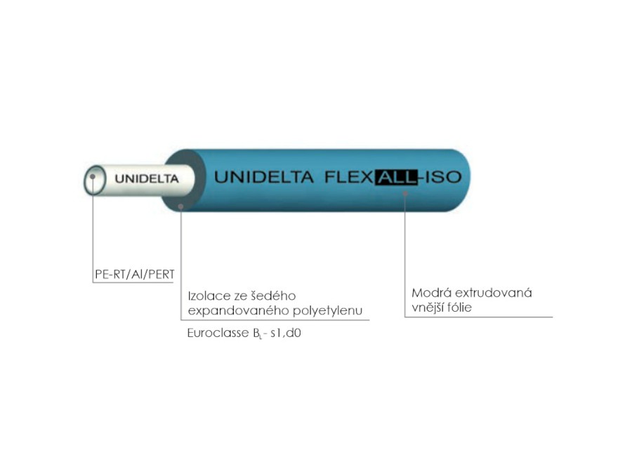 UNIDELTA FLEXALL trubka je PE-RT/Al/PE-RT trubka s izolací ze šedého expandovaného polyetylenu (PE). Na izolaci je navíc extrudovaná vnější fólie lesklé světle modré barvy.